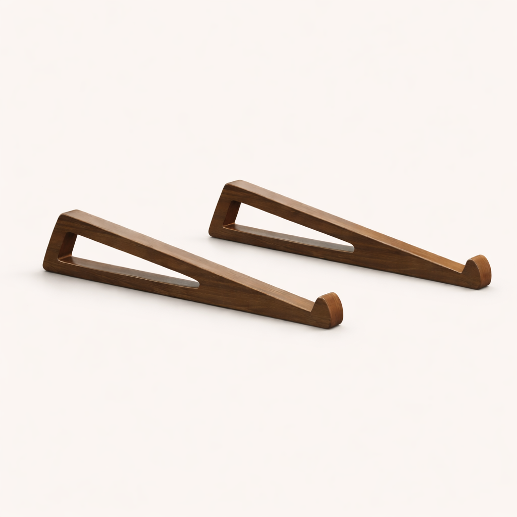 Drewniana konstrukcja delikatnie unosi urządzenie, nadając mu bardziej komfortowe ułożenie i sprzyjając swobodnemu przepływowi powietrza. Otwarta, lekka forma nie dominuje otoczenia, a jednocześnie zapewnia stabilność i poczucie uporządkowania. To przedmiot, który pozostaje w tle, ale realnie wpływa na wygodę codziennego użytkowania.