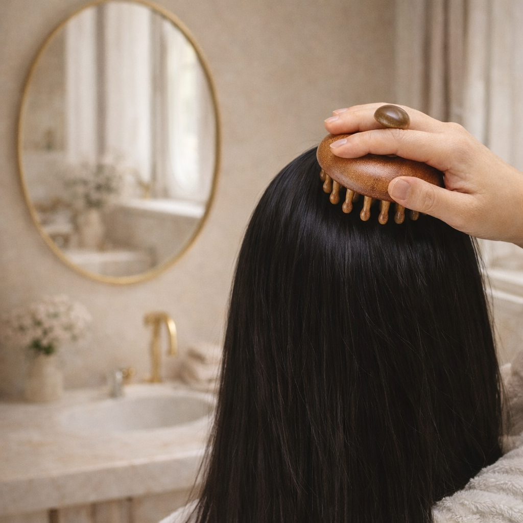 Drewniany grzebień zaprojektowany do delikatnego masażu skóry głowy oraz innych partii ciała w codziennej pielęgnacji.